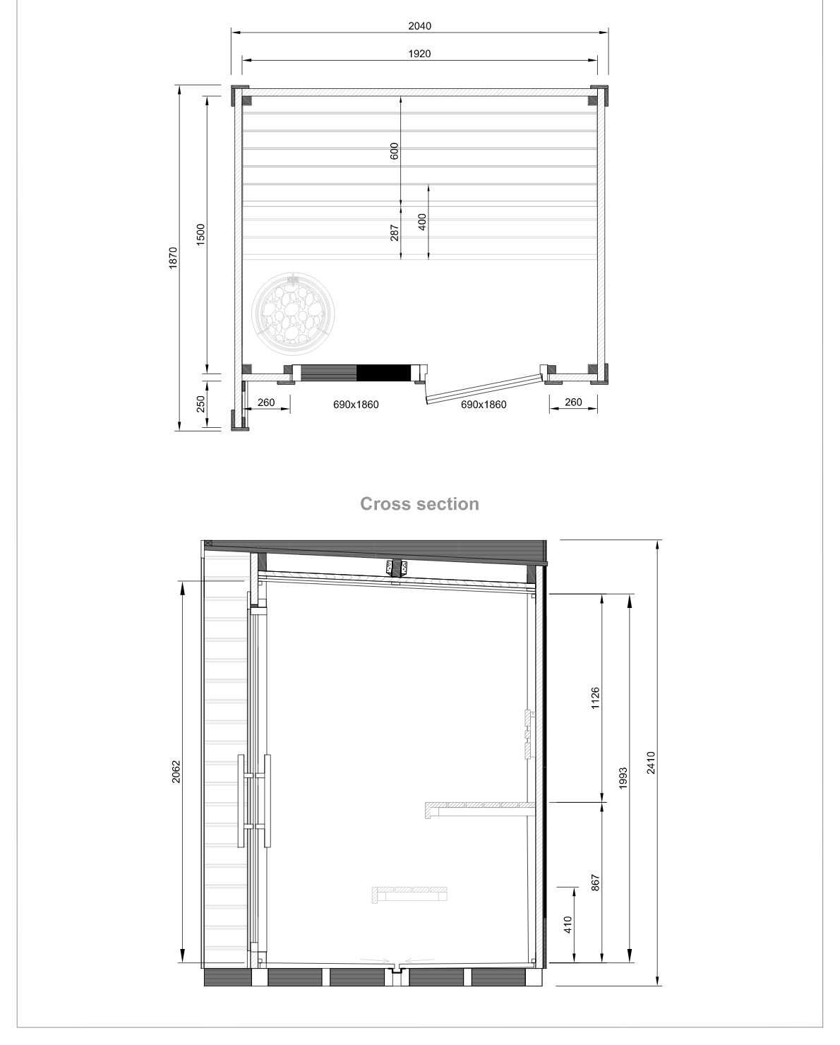 | Length of sauna room | 200 x 200 cm outside 192 x 192 cm inside |