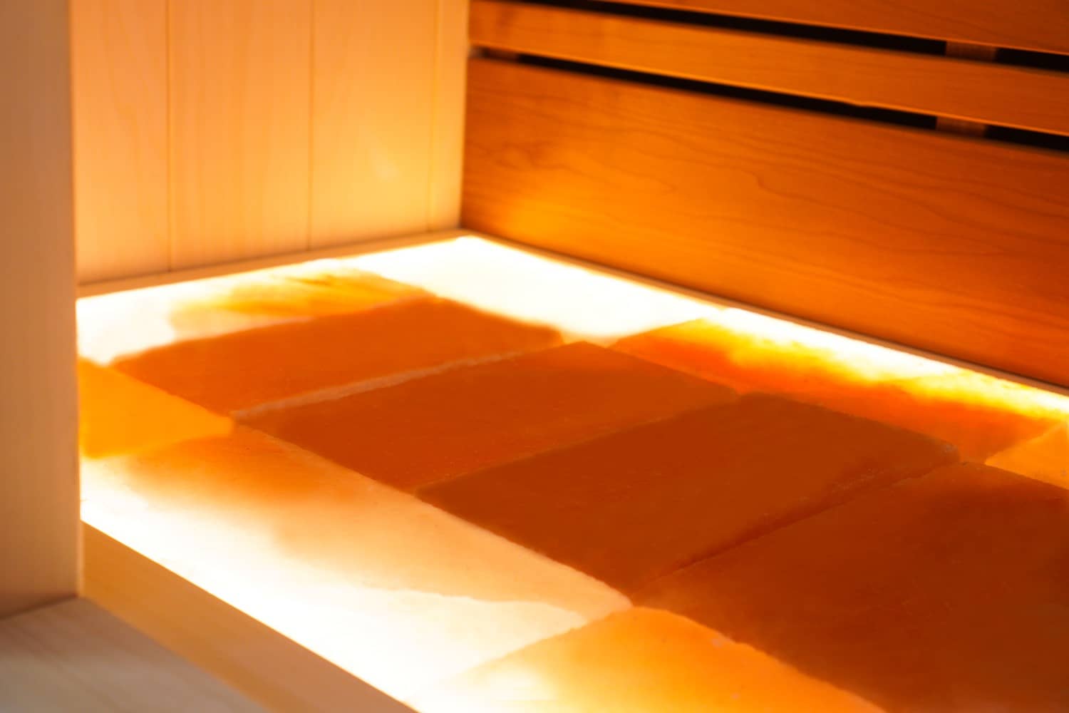 With our custom saunas, we offer various floor and roof options. Our saunas come standard with an openwork, gridded floor. There are also options for a solid floor or one with salt stones and built-in LED lighting. A wooden roof made of European aspen with an LED strip is included as standard.