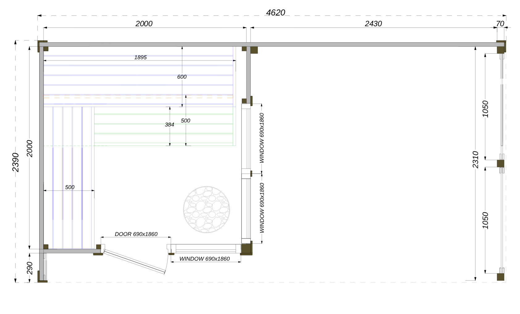 | Length of sauna room | upper bench 200 cm x 60 cm + corner bench 140 cm x 50 cm - lower bench 150 cm x 60 cm |
